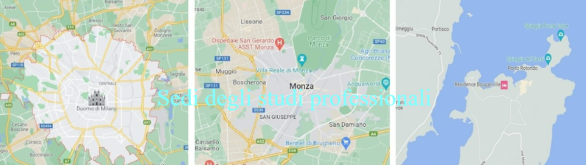 Lo studio di Monza è situato in via Ramazzotti (zona Ospedale Nuovo San Gerardo), lo studio di Milano è in Città Studi (zona Piazzale Loreto), lo studio di Olbia si trova a Punta Volpe (zona Porto Rotondo).